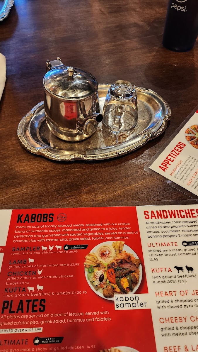 Greek yogurt with diced cucumbers and an array of hot spices with grilled za'atar pita and falafels.